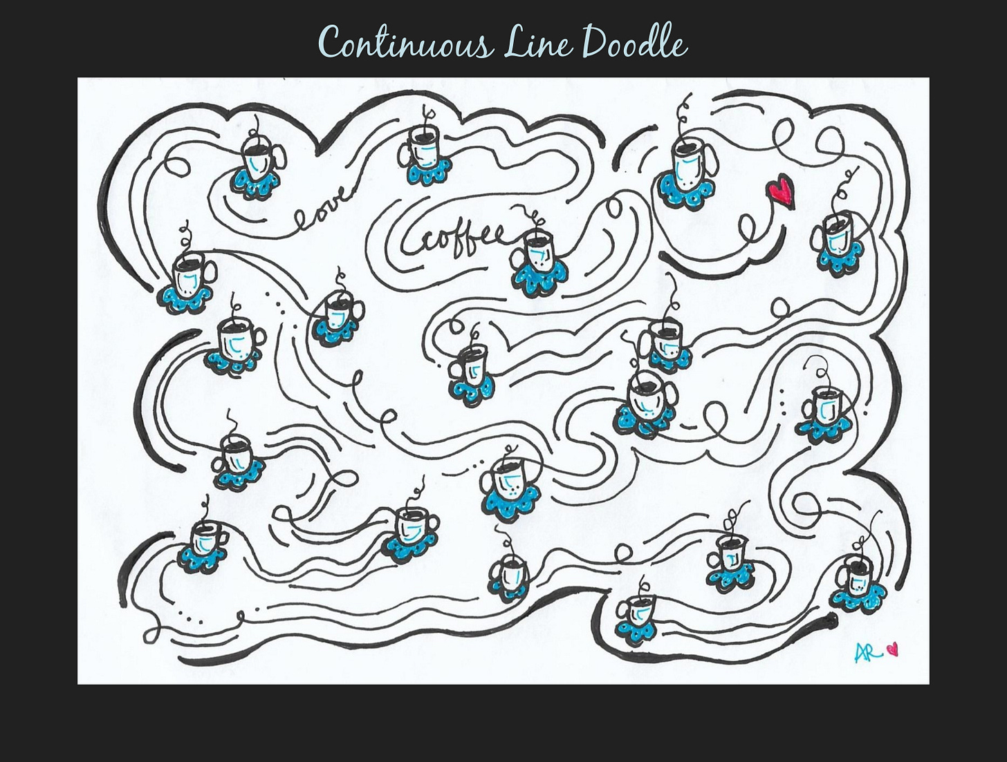 One morning, as I was scrolling, I noticed a “continuous line doodle” of a coffee cup. The picture resembled something that I had doodled many times, with one exception: Meagan’s coffee cups were attached by a continuous line. Immediately, I wanted to try it.