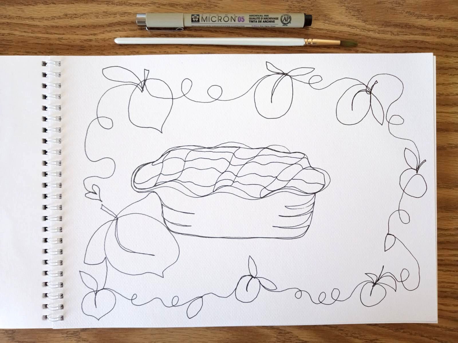 I started by visualizing my continuous line. I wanted a pie and a peach border. I looked at the pie from our From Blossoms to Jam Illustrations to help me visually follow the path.