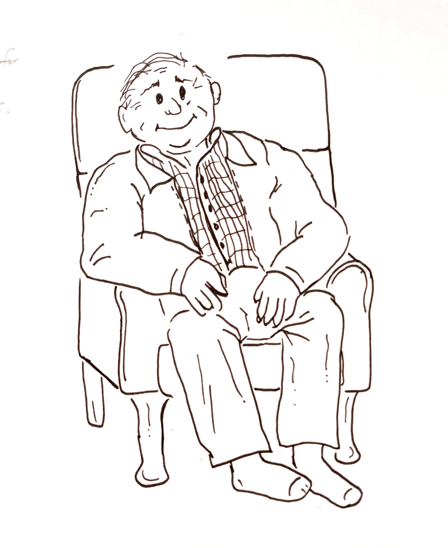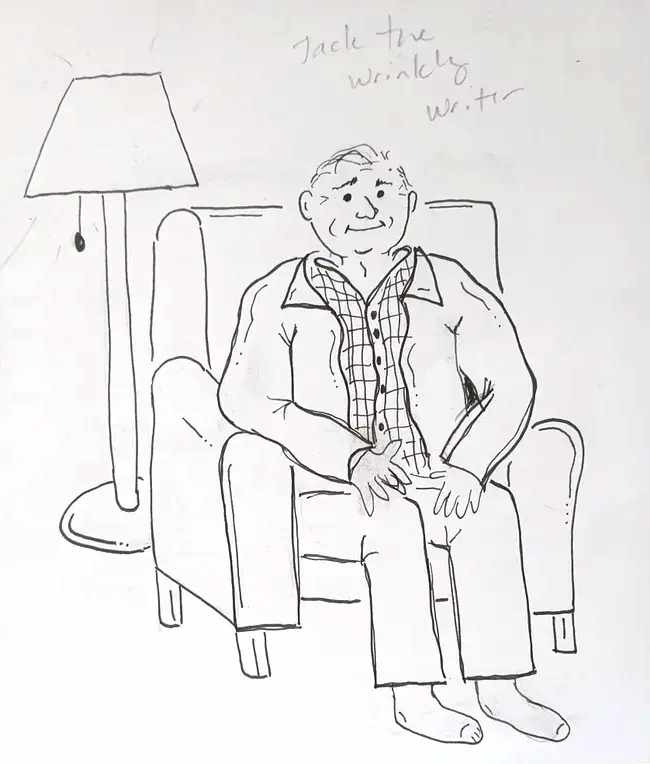 When I asked Jack what he thought about it, he said, “The concept is great. But if it matters, I slump/slouch when I sit. I just chat, never lecture. Your great sketch made me think I was either sitting in a dentist waiting room or waiting for judgment outside the school principal’s office.”