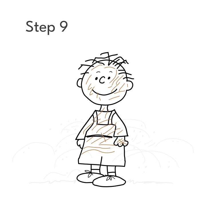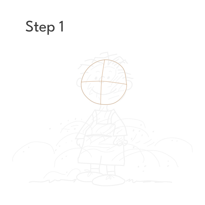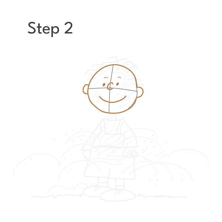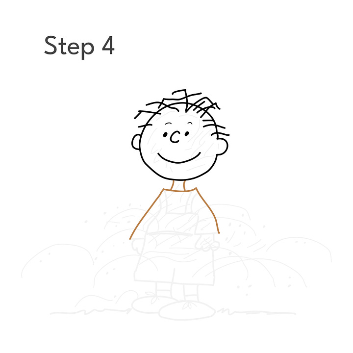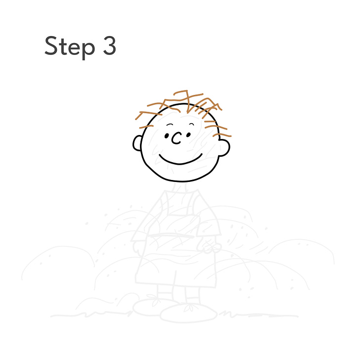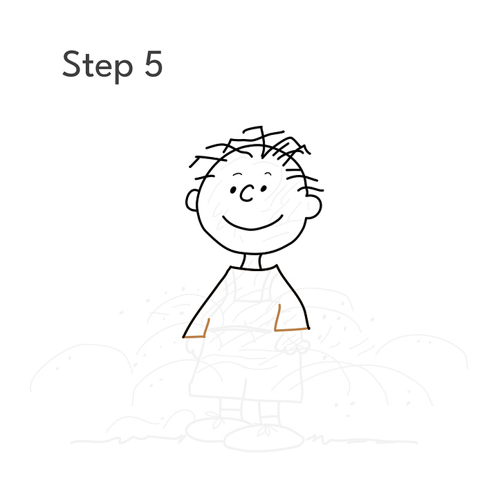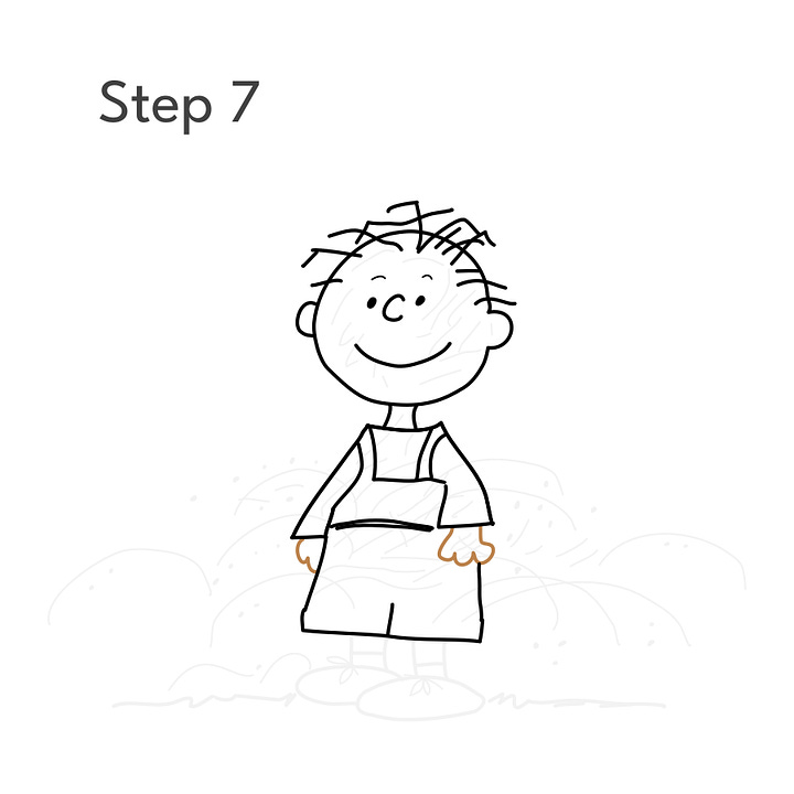 Step 2: Using the guides, draw Pigpen’s head and face. At this point, he looks a lot like Charlie Brown, but wait…