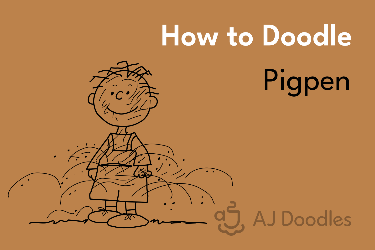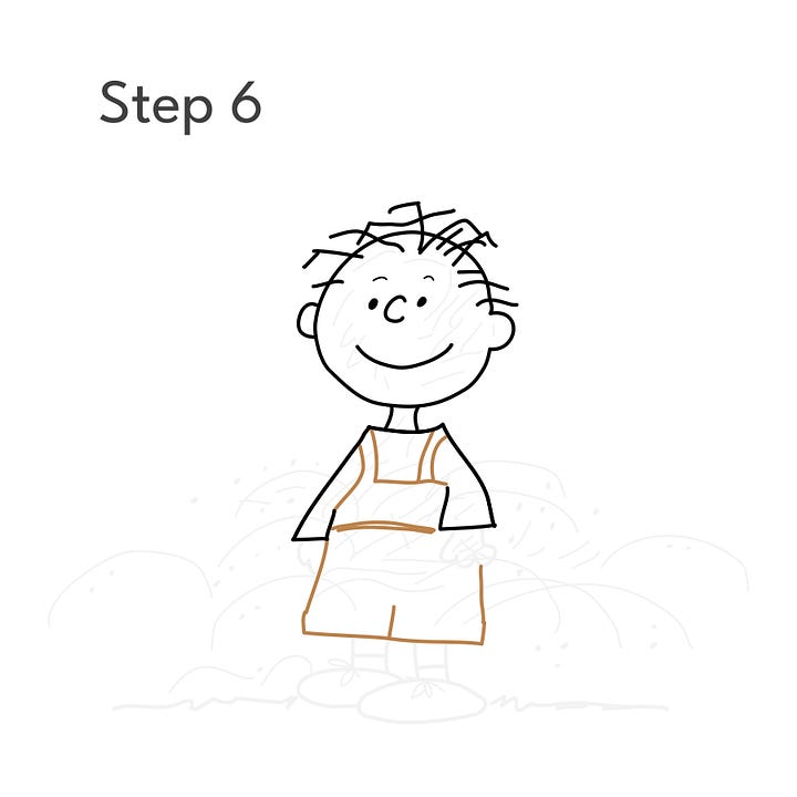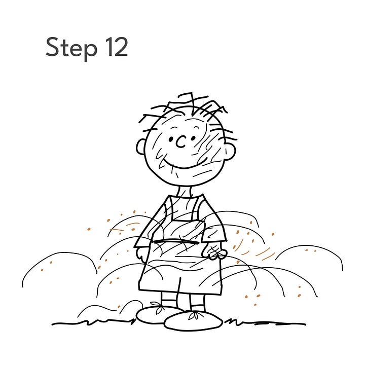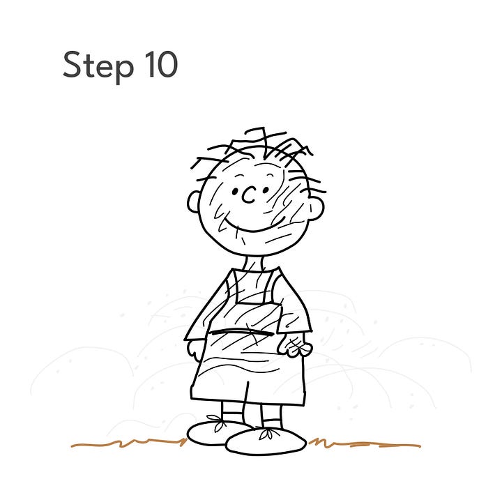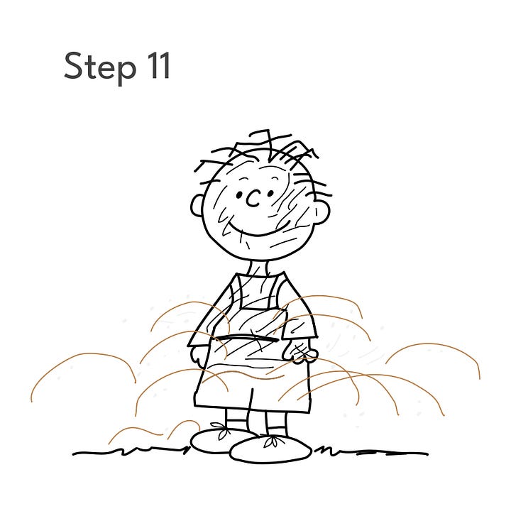 Step 2: Using the guides, draw Pigpen’s head and face. At this point, he looks a lot like Charlie Brown, but wait…