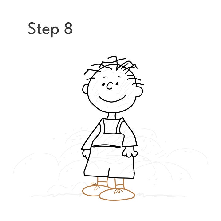 Step 8: Draw his legs, socks, and shoes. What a clean and neat kid! We’re not done yet.