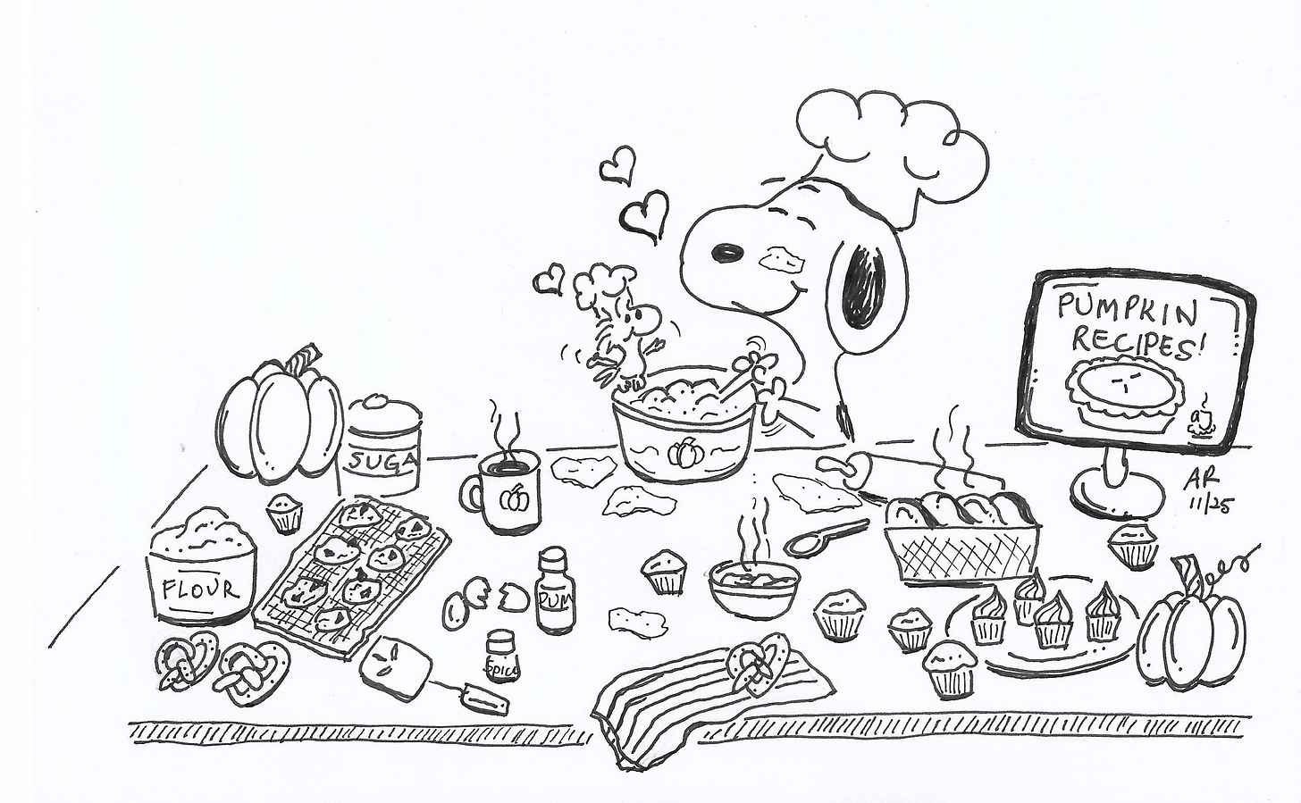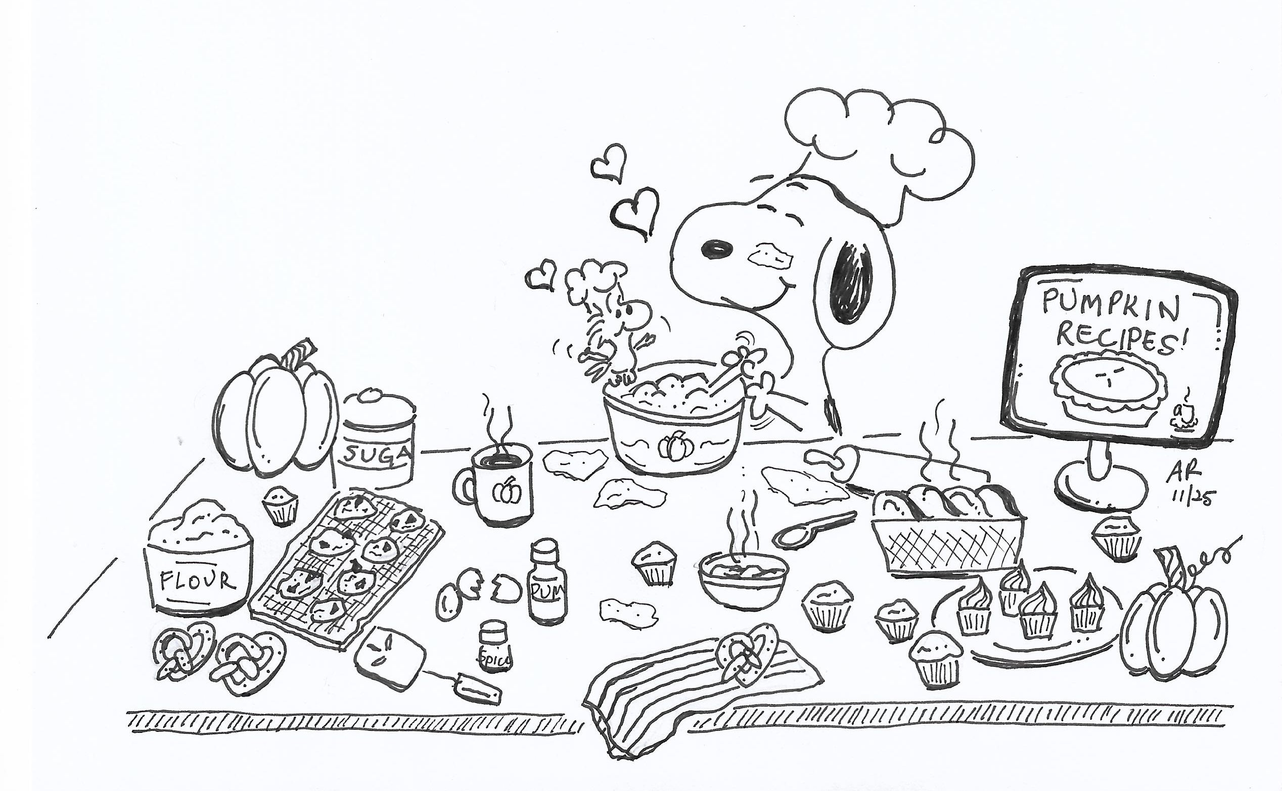 Here’s a little Snoopy drawing to express my happiness in bringing this project to fruition. It’s Snoopy working in the kitchen. He has the Pumpkin Recipe Book pulled up on his computer screen, and he’s making lots of recipes with his pal, Woodstock.